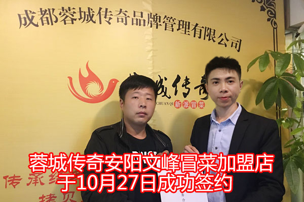 通過對市場的走訪與冒菜的品嘗,咨詢了吳總關(guān)于冒菜加盟的相關(guān)事宜,終于在10月27日成功與蓉城傳奇正是簽約,開啟了自己冒菜加盟店的創(chuàng)業(yè)路……